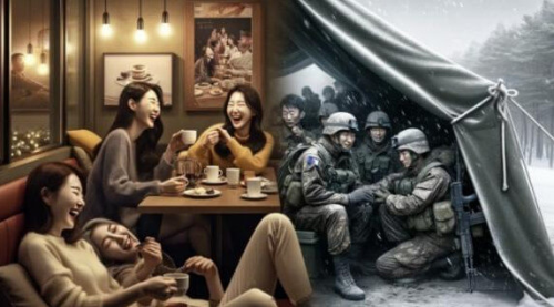 Ai가 그린 해당 그림에서 한국 남성들은 군대에서 총을 들고 굳은 표정으로 모여 야외에 앉아 있습니다.